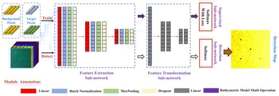 Underwater target detection can be implicitly explained as a binary classifier whose assignment is categorizing all the pixels into a target group or background group. Furthermore, the classification map and detection map have an identical physical essence which are both used to represent a confidence coefficient of being the target or background for each pixel. Consequently, we design a binary classifier based on deep learning methodology to finish the underwater target detection task. As illustrated in Figure 5, this particular target detection network is comprised of four subnetworks: Feature extraction sub-network, feature transform sub-network, supervised training sub-network, and detection sub-network.