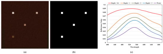 (1) Synthetic Data Based on Simulated Turbid Water: The first synthetic dataset is constructed with a simulated turbid water HSI whose water IOPs are provided by []. Meanwhile, the sheet metal material is appointed to be the targets of interest. The spatial solution of this dataset is and it possesses 150 bands covering from 400 nm to 700 nm. In terms of the depth values, we place the noisy underwater targets at 0.1 m, 1 m, 2 m, and 3 m concurrently. The detailed information of this dataset has been illustrated in Figure 6.