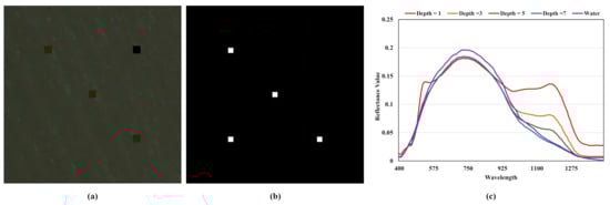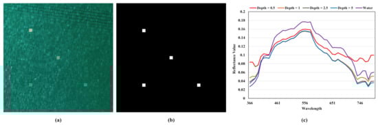 - Step 5: Exploit background pixel , IOPs parameters , , , and target spectra to figure out the corresponding underwater target spectra with different depth values H by Equation (1).
