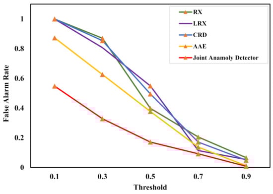 (1) Effectiveness Evaluation of the Joint Anomaly Detector: In Section 3.2, we have proposed a special joint anomaly detector which is assigned to select the target-associated pixels. To verify whether this detector is capable of further finding out the target-associated pixels, we employ four classical anomaly detection methods RX, LRX, CRD, and AAE to make a comparison. The mission of joint anomaly detector is picking out a pixel subset only containing target-associated pixels. Consequently, we calculate the FARs of the detection results under different thresholds as the comparison metric. For convenience, we merely perform this test on the first synthetic dataset and the calculation results are exhibited in Figure 10 and Table 3. Obviously, the joint anomaly detector has achieved the lowest FARs under all the given thresholds. Besides, this detector can achieve a satisfying FAR even if the threshold has been set as a small value. These phenomena indicate that the proposed anomaly detector can better eliminate the inference of background and attains a target-associated pixels selection result containing less background pixels which is more suitable for generating the guidance dataset.