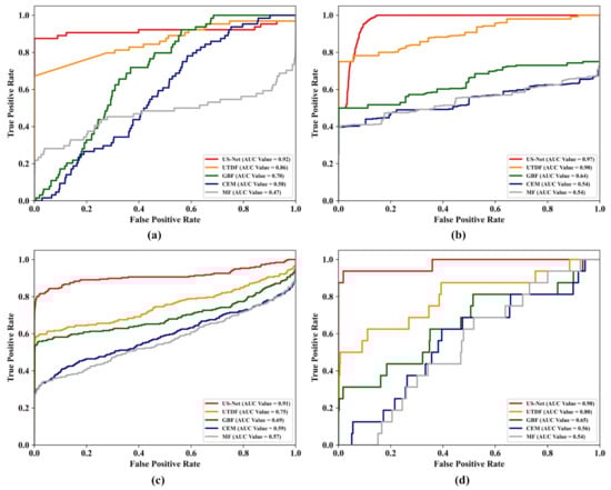 The ROC curves of for the compared underwater target detection methods on a (a) simulated water dataset, (b) sea water dataset, (c) river water dataset, and (d) lake water dataset.