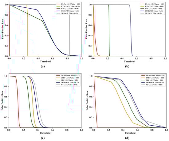 So as to conduct the qualitative analysis of the detection results, the ROC curves of and have been plotted as another two critical comparison metrics. According to Figure 12, the ROC curves of of our method remains over other curves in all the experimental datasets except for the simulated water dataset. Moreover, the ROC curves of of the SUTDF located at the bottoms of other compared methods for each dataset except the sea water dataset in Figure 13. Based on these two evidences, we could conclude that SUTDF creates a superior detection performance with the lower FARs.