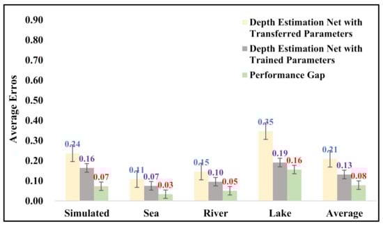 Exploring the generalization ability of the depth estimation provides an interesting perspective since it is a vital performance metric for our method in practical application. To prepare the datasets for this special experiment, we sample different experimental chips from the simulated water, sea water, lake water, and river water HSIs with the sizes of , , , and respectively and the desired targets with the same depth information as the original datasets are also embeded into these experimental chips. The network weight parameters derived from original datasets are transferred to yield one of the comparison depth estimation network while the other one is generated by training on the novel datasets. Note that the second network might possesses the best depth estimation capacity since it represents the training results of the new datasets, which is exploited as the reference to evaluate the decrease of estimation performance owing to the transfer operation. In order to demonstrate the compared results in a numerical aspect, the average depth estimation errors of all the target pixels are employed as the metric and the corresponding results are plotted in Figure 14. According to this figure, we can get to know that the performance gaps between two compared networks are slight for all the datasets, which could be ignored in real-world applications. Moreover, it is surprising to find that the performance gaps might be associated with the sizes of the datasets, since the performance gap in the sea water dataset resulted in being the slightest one while the performance gap in the lake water dataset refers to the most severe. In terms of the reason accounting for this phenomenon, it could intuitively be interpreted by the fact that the dataset with more training samples will lead to a better generalization performance.