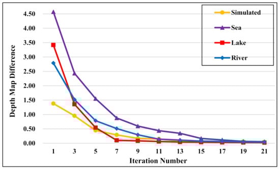 Furthermore, due to the specific iteration training scheme, the convergence of training process is also an important evaluation term for our proposed method. Obviously, depth map, referring to be the output of the depth estimation network, can be exploited as a reference to determine whether SUTDF has converged. Based on this viewpoint, we employed the discrepancy of depth maps between two iterations as a metric and a converging curve of the self-improving procedure has been plotted in Figure 15. From this figure we can know that the convergence speediness of framework is decreasing as the iteration number increases. Moreover, different datasets have disparate convergence iteration numbers which might be determined by the capacity of the dataset. In our research work, the framework trained with the lake water dataset requires the minimal convergence iteration number 7 while this dataset contains the least HSI pixels. On the contrary, the framework needs to go through 17 iterations for fitting the sea water dataset well, whose spatial solution is the highest among all the datasets.