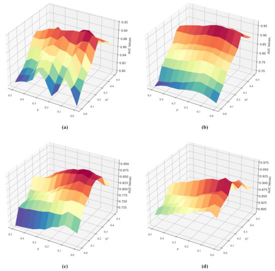 The 3D plots for AUC values of of the different experiments on a (a) simulated water dataset, (b) sea water dataset, (c) river water dataset, and (d) lake water dataset.