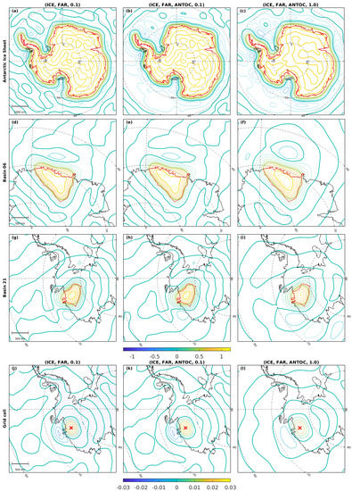 Comparable differences between the three variants can be observed for the TSKs of Basin 06 (Figure 2d–f) and Basin 21 (Figure 2g–i). Depending on the shape and the size of the basins, the single-basin TSKs deviate stronger from 1 along the basin boundary than the AIS TSKs. These deviations are largest for those parts of the basins bordering other AIS drainage basins, i.e., regions whose points are also part of cluster ICE. Hence, for any point of a basin close to the boundary to another drainage basin, the assumed signal variance is the same as for the points outside the basin. Thus, the weight applied for conditions (A) and (B) is identical, leading to TSKs which amount to 0.5 along the border between two contiguous drainage basins. In contrast to the AIS TSKs with and without considering the ANTOC pattern, the corresponding kernels for individual basins exhibit less pronounced differences between these two versions. Although these variations are smaller in magnitude, their existence is clearly revealed in the global view on the TSKs given in Figure S1. The minimization of the ANTOC pattern has a larger impact for Basin 06, which is larger in size and whose boundary shares a larger portion with the adjacent ocean than Basin 21. The basin size has also a major influence on the effect caused by the application of a larger constraint on mission errors, whose effect is larger for smaller basins. For Basin 21, the (ICE,FAR,ANTOC,1.0)-TSK does not even exceed 1.