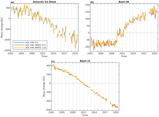 Mass change time series, i.e., the gravimetric basin product, for (a) the entire Antarctic Ice Sheet, (b) Basin 06 and (c) Basin 21 derived using different realizations of tailored sensitivity kernels.