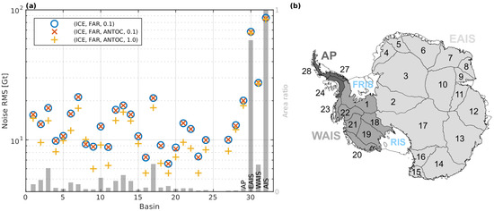 (a) Root mean square of the noise in gravimetric basin products for individual drainage basins and aggregations. Colored symbols indicate different realizations of tailored sensitivity kernels used to derive the basin products. Grey bars show the ratio between the basin area and the area of the entire AIS (linear scale at the right-hand side ordinate axis). (b) Overview of Antarctic drainage basins and aggregations (grey shades) based on the basin definitions by Zwally et al. [43]. FRIS and RIS indicate the location of the Filchner-Ronne Ice Shelf and the Ross Ice Shelf, respectively.