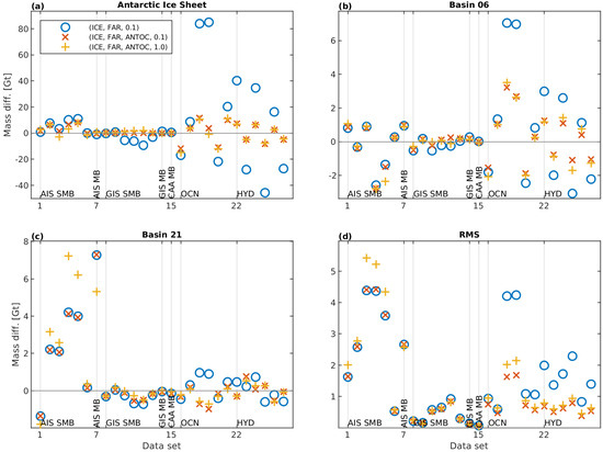 An increased weight for the mission error constraint, i.e., a larger degree of smoothing, may lead to increased signal leakage. This is also revealed by the differing mass balance estimates and becomes even visible from the mass change time series shown in Figure 3. The mass loss inherent to the AIS time series decreases from 92.5 Gt a for variant (ICE,FAR,ANTOC,0.1) to 90.9 Gt a for version (ICE,FAR,ANTOC,1.0). Since signal leakage depends on the spatial pattern of the ongoing mass changes, both over the region of interest as well as in its surrounding, an increased mission error constraint does not necessarily lead to a reduced mass loss. For example, applying a stronger mission error constraint for Basin 21 increases the mass loss by 1.7 Gt a. These indications are supported by the leakage assessment.