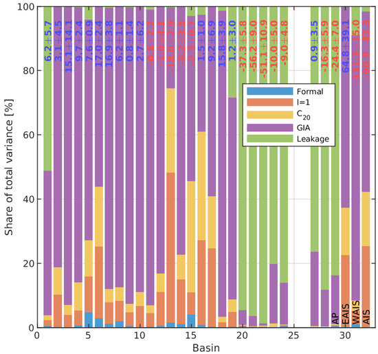 Components (bars) contributing to the overall uncertainty of the mass balance (numbers) for the final mass change basin products of variant (ICE,FAR,ANTOC,1.0). The overall uncertainty accounts for formal errors from the least-squares adjustment, for uncertainties of the degree addition, related to the replacement, of the glacial isostatic adjustment (GIA) model correction and for leakage errors. Bars indicate the components’ share of the total variance.