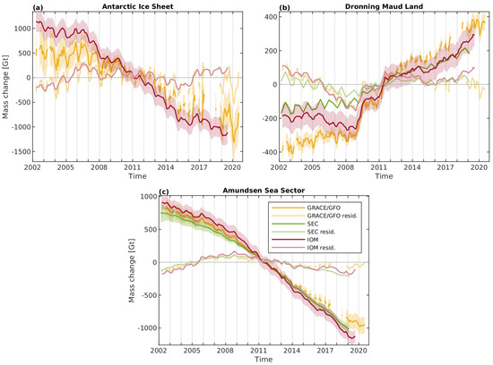 Mass change time series from GRACE/GRACE-FO using tailored sensitivity kernels of variant (ICE,FAR,ANTOC,1.0), from satellite altimetry-derived surface elevation changes (SEC, [61]) and from the input–output-method (IOM, [59]) for (a) the entire Antarctic Ice Sheet (AIS), (b) Dronning Maud Land (i.e., Basins 05–08) and (c) Amundsen Sea Sector (i.e., Basins 21–22). Faint lines indicate the corresponding residuals with respect to the linear trend over the period from 2002-04 through 2016-08.