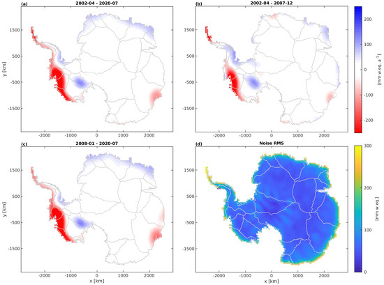 Figure 8d shows the noise level of the final gridded product with an RMS over all grid cells of 86.7 mm w.eq. This RMS value is about half the RMS of the two variants of products derived with a weaker mission error constraint (173 mm w.eq.). The largest noise can be found along the coastal margins, stemming from residual oceanic mass changes as revealed by the analysis the synthetic data sets on a grid cell level [18]. However, compared to our products contributed to the round robin experiment of the CCI ice sheet projects [18], the noise level could be significantly decreased. This reduction goes back to an improved data quality of the up-to-date GRACE/GRACE-FO solutions as well as an adapted weighting of the cluster FAR, whose increased weight led to a reduction of leakage from near-coastal oceanic signals.