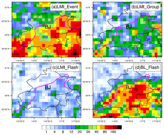 Spatial distributions of the LMI (a) events, (b) groups, (c) flashes and (d) BLNET-detected lightning flashes in Beijing (unit: number/0.1° × 0.1°) for the convective episodes used in this study in the summers of 2018 and 2019.