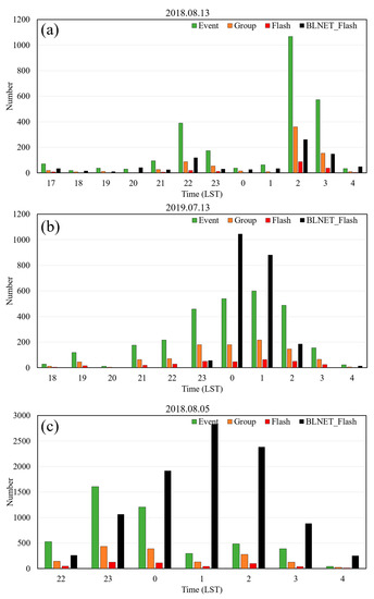 Hourly evolution of lightning data provided by the LMI and BLNET during the chosen convective cases (a–c) (unit: number h−1).