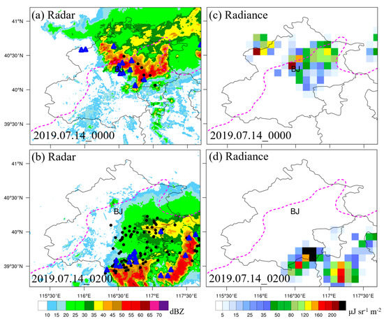 Composite radar reflectivity (unit: dBZ) at (a) 0000 LST and (b) 0200 LST on 14 July 2019. The blue triangles represent the LMI-detected lightning flashes, and the black dots represent the BLNET-detected lightning flashes during the 6-min radar scanning period. In the right column, the accumulative optical radiance energy values (c,d) are calculated by summing the 30-min event optical radiance values (unit: μJ st−1 m−2).