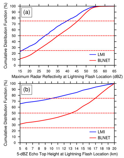 Cumulative distribution functions of (a) maximum radar reflectivity and (b) 5-dBZ radar echo top height in regions associated with LMI-detected (blue line) and BLNET-detected (red line) lightning flashes.