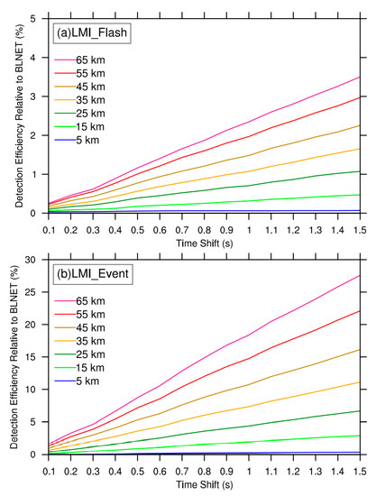 Several studies have reported the preliminary performance of LMI lightning detection relative to ground-based lightning location systems such as WWLLN [7,8] or ADTD [9]. However, these results mainly focused on CG lightning stroke and detailed investigation of the total lightning detection performance of LMI are required yet. Given the total lightning detection capability and high DE of BLNET [21], the BLNET flashes were used as observation truth in this study to quantitively evaluate the detection capability of the LMI. The space-borne LMI tracks the optical signals of lightning at cloud tops with a pixel-resolution of several kilometers, while the ground-based BLNET accurately pinpoints the electromagnetic pulses. Considering the different spatial resolution of the two sources of lightning data, direct point-to-point comparisons between these two lightning detection systems are not possible. Hence, a set of spatiotemporal criteria was applied to reasonably match the BLNET flash and LMI lightning products. Assuming each lightning flash is detected by BLNET, then the BLNET-detected flashes are checked whether they are accompanied by the LMI lightning products (flashes and events) under specific spatial-temporal matching criteria. If a BLNET-detected flash has its corresponding LMI lightning products, we hold that LMI successfully capture the signals of this lightning occurrence. Figure 8 shows the LMI DE relative to BLNET flashes under different spatial and temporal criteria. When applying restrictive matching criteria such as 35 km and 330 ms, which were used in the GLM DE evaluation by Marchand et al. [24], the LMI flash-based DE can be less than 1% relative to the total lightning data from BLNET. However, such a relative DE is quite dependent on the specified spatial and temporal matching criteria. For example, the relative DE of LMI increases rapidly when less strict spatiotemporal matching criteria were used, and the LMI flash-based DE ranged between 1.5% and 3.5% with 1.5 s and 35–65 km matching scales (Figure 8a). Since the LMI flash is the algorithmic representative of illuminated pixels detected by the lightning imager, the elemental LMI events can better reveal whether LMI captures any optical signals in each lightning occurrence and avoid the impacts of flash clustering algorithm on the calculated flash-based DE. To gain a true insight into the LMI lightning detection capability, the BLNET-detected lightning flashes were matched with LMI events if they both occurred within the matching criteria. Results show that LMI event-based DE is approximately 2.5% within 330 ms and 35 km and increases to 28% within 1.5 s and 65 km during all CEs occurred in the summers of 2018 and 2019 (Figure 8b).