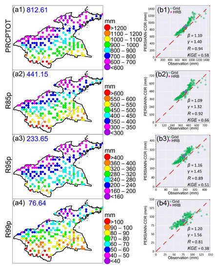 Spatial patterns of multi-year annual means of observational amount-based indices and the scatterplots between observation and PERSIANN-CDR. a1–a4 (b1–b4) are for PRCPTOT, R85p, R95p, and R99p, respectively. In a1–a4, the blue numbers represent the HRB mean for a given extreme precipitation index. The red dashed line within b1–b4 is the 1:1 line.