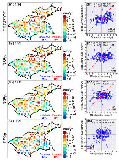Spatial patterns of the temporal trends of the observational amount-based indices (a1–a4), and the scatterplots between observation and PERSIANN-CDR. a1–a4 (b1–b4) are for PRCPTOT, R85p, R95p, and R99p, respectively. In a1–a4, the black numbers represent the HRB trends of the observational amount-based indices, while the blue (red) numbers indicate grid percentages with increasing (decreasing) trend across the HRB. The red dashed line in b1–b4 is the 1:1 line.