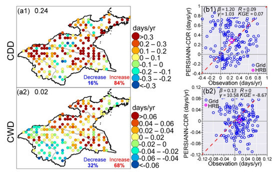In view of observations, the two duration-based indices for the HRB differently increased, with a rate of 0.24 days/yr for CDD and 0.02 days/yr for CWD (Figure 7a1,a2). Spatially, the positive trends of the observational CDD occurred at 84% of grids, followed by decreasing trends at 16% of grids in central-northern and southwestern parts (Figure 7a1). There existed >30% of grids with decreased CWD, generally in western HRB, while increased CWD was widely distributed across eastern HRB, with a grid percentage around 70% (Figure 7a2). For the HRB, the CDD trends were overestimated by the PERSIANN-CDR, with β of 1.20 (Figure 7b1), while the product seriously underestimated (β = 0.12) the CWD trends (Figure 7b2). In terms of γ, the PERSIANN-CDR overestimated spatial variabilities of both CDD and CWD trends, especially for CWD, with a serious overestimation (γ = 10.58) (Figure 7b1,b2). Overall, there was no ability (R < 0.10) for the PERSIANN-CDR to produce spatial patterns of the trends of the duration-based indices, accompanied by no KGE-based ability (KGE near to 0 and even < 0) (Figure 7b1,b2).