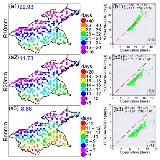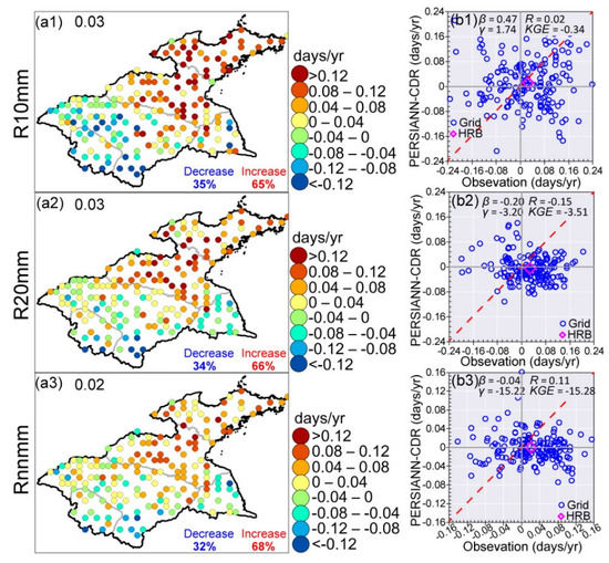 Spatial patterns of the temporal trends of the observational frequency-based indices and the scatterplots between observation and PERSIANN-CDR. a1–a3 (b1–b3) are for R10mm, R20mm, and Rnnmm, respectively. In a1–a3, the black numbers represent the HRB trends of the observational frequency-based indices, while the blue (red) numbers indicate grid percentages with increasing (decreasing) trend across the HRB. The red dashed line in b1–b3 is the 1:1 line.