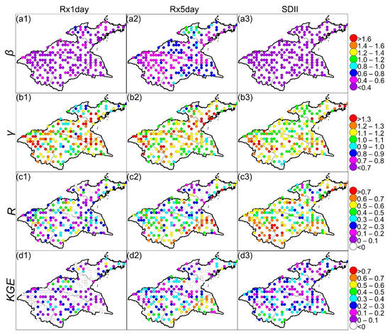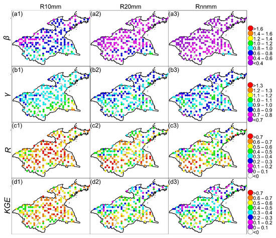 Seen in Figure 9a1, except for 4% of grids in the southern part with smaller overestimations (β between 1.00 and 1.10), the PERSIANN-CDR differently underestimated R10mm at the remaining grids. Regarding R20mm and Rnnmm, the underestimations (β < 1.00) occurred at an overwhelming majority (>98%) of grids, of which >80% of grids corresponded to larger underestimations (β < 0.60) (Figure 9a2,a3). Based on γ, temporal variabilities of the three frequency-based indices were differently underestimated at >75% of grids (Figure 9b1–b3); larger underestimations (γ < 0.8) for R20mm in northern HRB and for Rnnmm in northern and central-southern parts (Figure 9b2,b3). Moreover, there were some grids with overestimated temporal variabilities (γ > 1.00) of the frequency-based indices, e.g., R10mm and R20mm at >15% of grids, generally in southern HRB (Figure 9b1,b2). It is evident that the PERSIANN-CDR had strong ability (R > 0.50) to represent temporal fluctuations of R10mm at 89% of grids, which were widely distributed across the HRB; for R20mm and Rnnmm, there existed >50% of grids with R > 0.50, mainly in southern HRB (Figure 9c1–c3). Obviously, the PERSIANN-CDR exhibited a better overall performance (KGE > 0.40) in detecting R10mm at all the grids (Figure 9d1). Except for < 15% of grids, generally in northwestern and northeastern HRB with no estimation ability, southern HRB corresponded to KGEs > 0.20 for Rn20mm and Rnnmm (Figure 9d2,d3), particularly for most grids of southern HRB, with KGEs > 0.5.