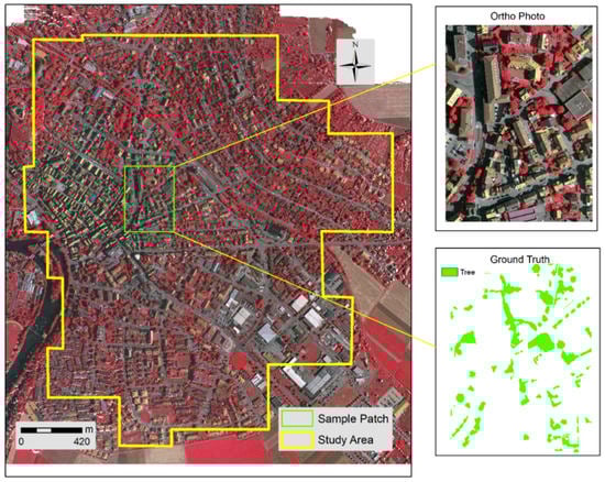 This study utilized an image dataset published by the International Society for Photogrammetry and Remote Sensing (ISPRS). Images were taken over Vaihingen, Germany in 2013 (Figure 1). The dataset contains 33 patches, each of which consists of an orthophoto and a labeled ground truth image. The orthophotos have three bands, near-infrared (NIR), red, and green with a spatial resolution of 8 centimeters (cm).