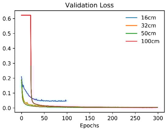 Figure 4 shows how the Dice loss changes at each epoch for the four experiments during the model training process. As the number of epochs increases, the Dice loss drops rapidly and stabilizes at Epoch 99, 243, 97, and 300 for the 16-cm, 32-cm, 50-cm, and 100-cm experiment, respectively.