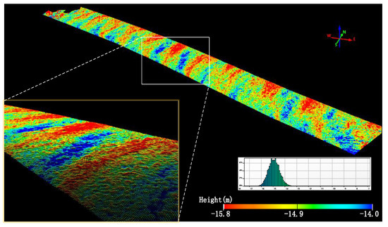 However, the ocean is a complex physical system; the ocean surface is the interface between air and water which always maintains irregular undulations under the influence of currents, tides, winds and other dynamic factors. As shown in Figure 1, the wave height and wavelength of the point cloud of the water surface undulations obtained by the ALB system are not constant. This uncertainty of the water surface is an important factor reducing the accuracy of underwater target detection, which is reflected in the energy loss of the echo signal and echo waveform broadening [10,11]. In addition, changes in the propagation direction and velocity of the laser beam as it passes through air and water affect the detection accuracy of the systems [12,13]. The maximum refraction error from water undulations is between 1% and 2% of the depth of the area [14,15].