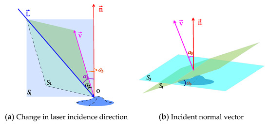 Figure 7 shows a schematic diagram of the laser refraction process. If we set and , the relationship between the two vectors can be expressed as follows: