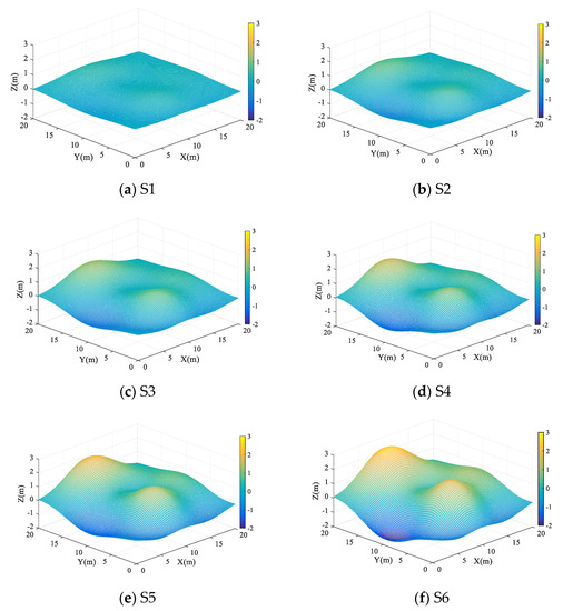 where are amplitude parameters of the wave surface model, and are range parameters. To accurately analyze the differences in normal vector estimation results under different conditions of surface elevation complexity, we use the wave surface simulation model above to simulate six surfaces with different elevation variation characteristics (S1~S6). S1~S6 in Figure 8 are simulated surfaces with different undulation characteristics that gradually change from gentle to violent.