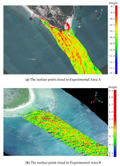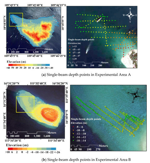 To verify the general applicability of this method, we selected two coastal areas as experimental areas. There are obvious differences in the geographical environment and data acquisition process in the two experimental areas. Experimental Area A is located in northwestern Wuzhizhou, which is an island belonging to Hainan Province, China (Figure 9b). The water depth is less than 20 m in the experimental area. The area has a sandy seafloor, and the underwater terrain varies with the seasons, but there are few reefs on the seabed. A Secchi disk was used to test the water transparency, and the result was approximately 7 m.