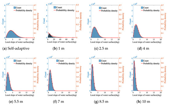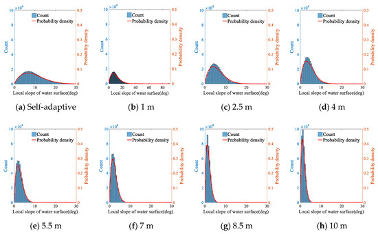 Incidence angle distribution on the ocean surface undulations ((a). Point cloud of the water surface, (b–h). Incidence angle distribution with different estimation radii.).