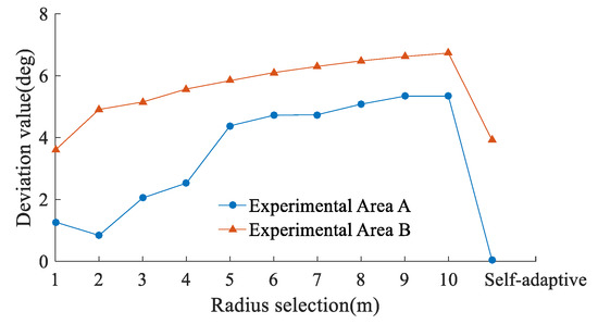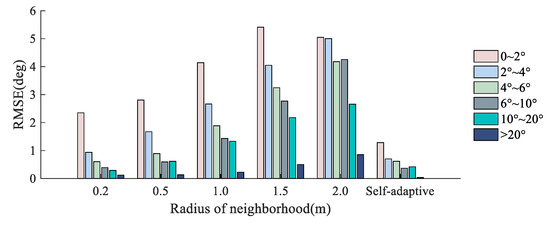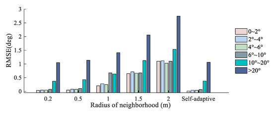 Figure 6 shows the sea surface point clouds and the models of the surface correction values for the laser incidence angle. The distributions of the correction values calculated by the PCA method with different fixed neighborhood radii are displayed in Figure 6. Before we use a fixed neighborhood radius to correct the angle of incidence, resampling and interpolation are implemented on uneven surface point clouds.