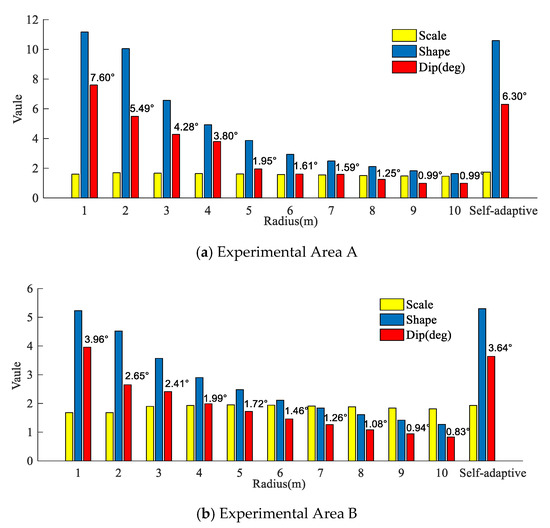 - Principal component analysis and feature dimensionality calculation. As the radius of the selected neighborhood points gradually increases from , to , PCA is performed on the data for each radius. The eigenvalues , and are calculated according to Equation (6), where . Based on the eigenvalues, the values of feature dimensionality are calculated as follows:
