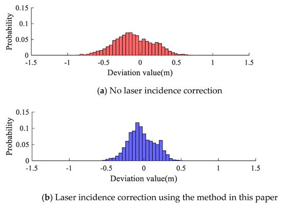 The statistical result of Experimental Area B in Figure 22 also shows a similar characteristic to that of Experimental Area A after laser surface incident correction. Table 3 contains the average and the RMSE of deviations between the correction result and the single-beam depth point in the two experimental areas. In Equations (27) and (28), is the depth value of a single beam on the seafloor, and is the depth value of the seafloor mesh obtained by ALB at the corresponding position. is the number of the single-beam depth points. is the average of the deviation value, and is the RMSE.