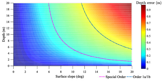 As in the above analysis, first, choosing a stable water surface environment is generally beneficial for ALB water surface incidence correction. In addition, waves will adversely affect the applicability of the ALB system’s depth measurement results. As shown in Table 12, when the surface slope is greater than 5.85° and 11.57°, the bathymetric error with a depth of more than 10 m may exceed the accuracy requirements proposed by the IHO S-44 Special Order and Order 1a/1b, respectively. In other words, if the bathymetric error is larger than the corresponding order standards, the water surface waves will cause obvious interference to the ALB system’s bathymetric accuracy; in that case, the adjustment of the ALB system’s sounding results by the laser incidence correction model is necessary.