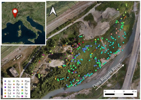 The research was carried out in an alpine riparian area of the Dora Riparia river, in the Western Italian Alps (Salbertrand, Susa Valley—45.074000 N, 6.892200 E). The study site is an area of approximately 9 hectares located at an elevation of 1000 m a.s.l. (Figure 1). The climate is typically warm and temperate and, according to the meteorological station of the Regional Agency for the Protection of the Environment (ARPA Piemonte) located nearby at 1050 m a.s.l. (45.071204 N, 6.893979 E), the average annual temperature is about 8.2 °C and annual average precipitation is 701 mm (mean 1993–2017).