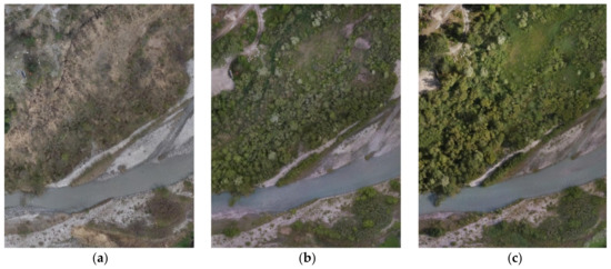 Detail of the orthomosaics of the RGB sensors resulting from the photogrammetric process. (a) Epoch I, March; (b) Epoch II, June; (c) Epoch III, July.