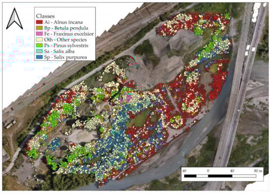 In this framework, the individual tree and shrub species mapping of habitats 91E0*and 3240 of the Natura 2000 network is consistent with the scientific relevant literature on the topic. It is worth considering the study area’s complexity and the difficulties related to the field data collection. Some classes are not remarkably accurate (B. pendula and F. excelsior), mainly due to the inadequate number of field samples and their low frequency in the area. The authors could have considered including F. excelsior and B. pendula in the “Other species” class (Oth), but mapping their presence was fundamental because they are species of physiognomic reference in 91E0* and 3240 Natura 2000 Habitats. Lidar technologies could improve the classification of B. pendula; indeed, the species has a characteristic crown shape due to slender and pendulous twigs. Similarly, enhancing the spectral detail by integrating hyperspectral cameras could have played a key role in spectrally separating B. pendula and F. excelsior and, generally, improving the classification accuracy.