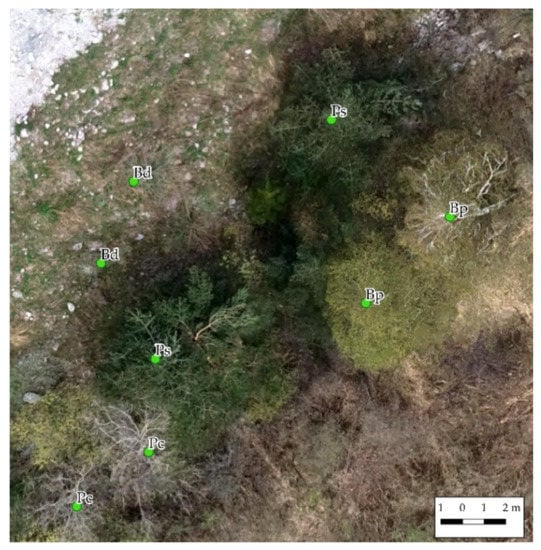 Detail of Pinus sylvestris (Ps) and Betula pendula (Bp) in epoch I (March). The other species (Bd and Pc) are still without leaves.