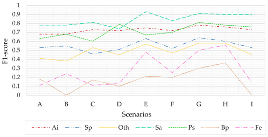 The comparison of scenarios I and G (respectively, without and with SMOTE) proves the effectiveness of the borderline SMOTE algorithm in this particular application. An improvement of the F1-score from scenario I to scenario G is detected for all classes, and the represented classes without training (B. pendula and F. excelsior) significantly benefit from the SMOTE (plus 0.30 on the F1 score from scenario I to G, Figure 6).