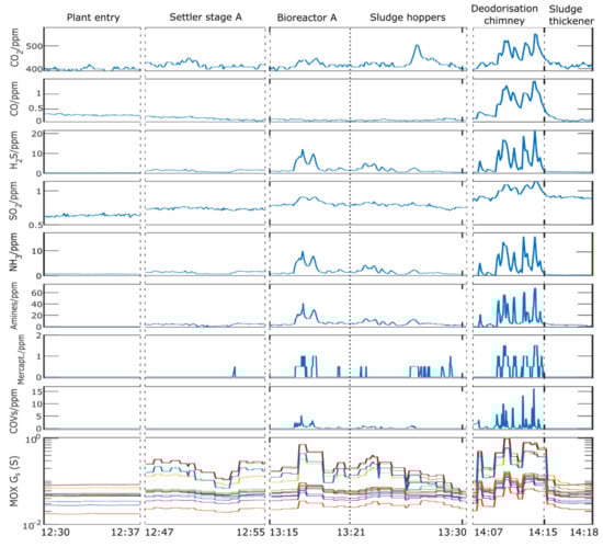 The raw sensor signals throughout the experiment are shown in Figure 6. The highest gas concentrations were recorded near the bioreactor stage A (P2) and the deodorization chimney (P4). The high variability of the sensor signals at the chimney is a consequence of the oscillations of the sampling tube around the chimney outlet due to the wind. The oscillations of the sampling tube were less problematic in the area sources because, since the concentration is more homogeneous, the exact location of the sampling point is not as critical as in ducted (point-like) sources. Very low concentration of all gases was measured near the settlers (P1) despite a strong malodor could be appreciated near this site. Only the response of the MOX sensors was distinguishable from the blank measurements, which may indicate that odor from this source was produced mostly by VOCs rather than by H2S or NH3. A peak of 100 ppm of CO2 above the background level was measured near the sludge hoppers (P3) during sludge discharge into a truck. Finally, low concentrations were measured at the sludge thickener (P5) probably because it was covered.