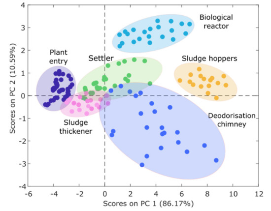 One research question of this work is whether the different emission sources could be distinguished based on the e-nose signals. A PCA score plot of the signals recorded while the drone was hovering over the sources revealed that this is indeed the case, and the different emission sources are clustered in different regions of the PCA space (Figure 8). This suggests that each source has a different gas composition, so the e-nose could be potentially used to identify which source is responsible for a certain measurement. Even the settler (P1) and sludge thickener (P5) could be differentiated from the blank measurements (P0) despite the gas concentrations measured at these sources were very close to the baseline level. This result, which may be a consequence of the low limit of detection (LOD) of MOX sensors, should be confirmed with more measurement campaigns and using external validation (blind) samples.