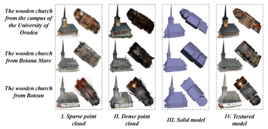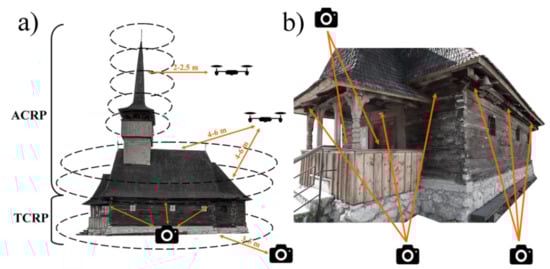 The data acquisition process was based on using a hybrid approach combining terrestrial close-range photogrammetry (TCRP) and aerial close-range photogrammetry (ACRP) for the obtaining of high-quality models, suitable for interactive viewing. The approach tends mainly to be used for modelling buildings or other large scenes (such as wooden churches) since it allows the smooth procuring of photographs while making even the most isolated parts of the object in question accessible. The many studies that are included in the literature [