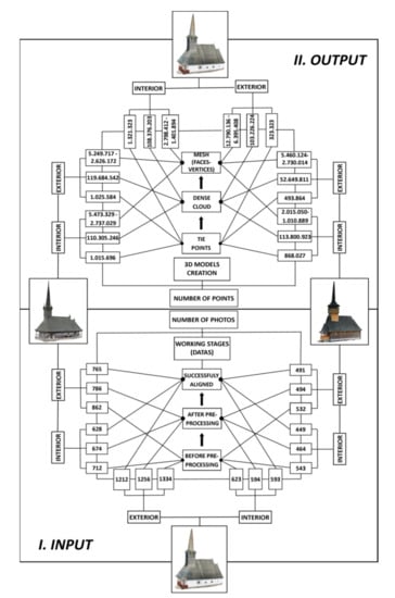 Thus, both for the lower part of the churches and for their interior, the data required was acquired by employing the TCRP technique, using a Mirrorless Canon EOS R camera with 30.3 MP resolution, featuring a Full Frame RF 24-105 f4 L IS USM lens. The overflight, using an unmanned aerial vehicle (UAV), of the upper parts of the churches concerned used a DJI Mavic 2 Pro, with a one-inch CMOS sensor and 20 MP, and a camera featuring ND16/PL, ND8/PL, and ND4/PL filters, depending on the time of day when the photographs concerned were taken and on the degree of brightness that was present in the outdoor environment. To obtain the best results possible and a reconstruction that closely resembled the original object, in terms of the geometry and texture involved, all the photographs were taken in RAW format (.DNG—Mavic 2 Pro, CR3—Canon EOS R).