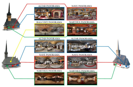 For each church, it was decided to make between three or four panoramic images, depending on the complexity of the monument and the degree of interest that its interior presented. In accordance with the above, with the operator positioned in the middle of the rooms, between 60 and 72 images were acquired for each scene, in spherical format (