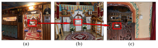 Given that the degree of brightness inside the wooden churches was often insufficient and improperly positioned for the taking of panoramic images (for instance, positioning the light sources on the ceiling did not favour the capturing of the vault and the iconostasis that comprised some of the most interesting features of the monuments), to avoid any possible distortion, a controlled light environment was chosen. In this respect, the same light spotlights and the same working methodology were used as are commonly employed in the case of interior photogrammetry, with the spotlights being, each in turn, positioned in the direction of the scene to be photographed and at a constant distance from each other. Such an arrangement meant that they could receive approximately the same amount of light as each other, thus helping to ensure the luminous balance that was necessary for the panoramic images taken to be able to benefit from smooth translation.