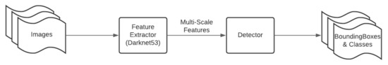 The model architecture was based on Joseph Redmon’s convolutional neural network one-shot detector model YOLOv3 [29], and this specific implementation was developed based on two GitHub repositories: qqwweee’s keras-yolo3 [30] and AntonMu’s TrainYourOwnYOLO [31]. YOLOv3 was used for this work because of its high detection accuracy and very fast speed [29]. A basic explanation of the YOLOv3 framework follows. The YOLOv3 network framework can be divided into two components: a feature extractor and a detector (Figure 1). Each input image is automatically resized to a width and height of 416 × 416 pixels before entering the feature extractor. YOLOv3 uses Darknet53 which outputs feature maps at three different scales. These feature maps are then provided as input into the detector which initially predicts three bounding boxes. The most suitable bounding box out of the three is output by the detector, represented as the predicted bounding box center point, width and height, confidence, and class label. The model uses transfer learning, and weights were pretrained on the ImageNet1000 dataset [32].