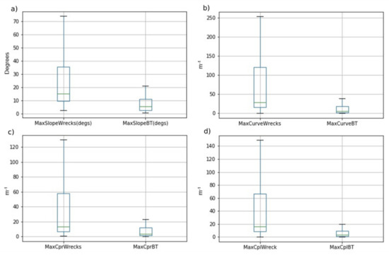 Box and whisker plots comparing the (a) maximum slope, (b) curvature, (c) curvature-profile, and (d) curvature-planar of the shipwrecks to that of the background topography.